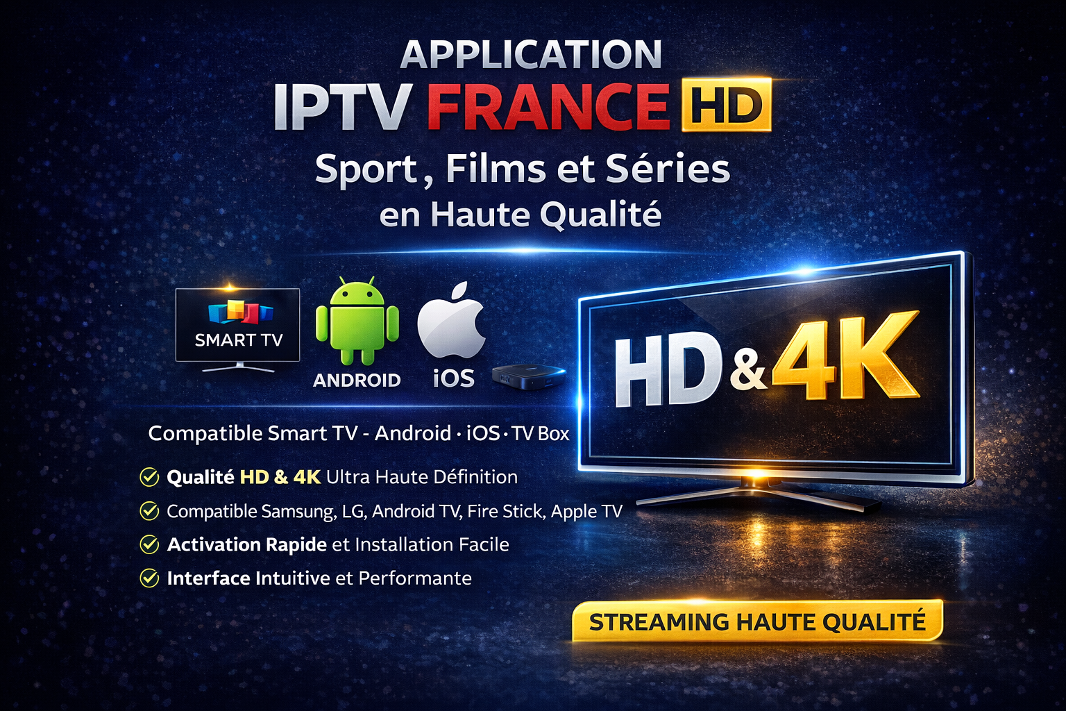 Application IPTV France HD & 4K – Sports, films et séries. Compatible Smart TV, Android et iOS. Installation et activation rapides.