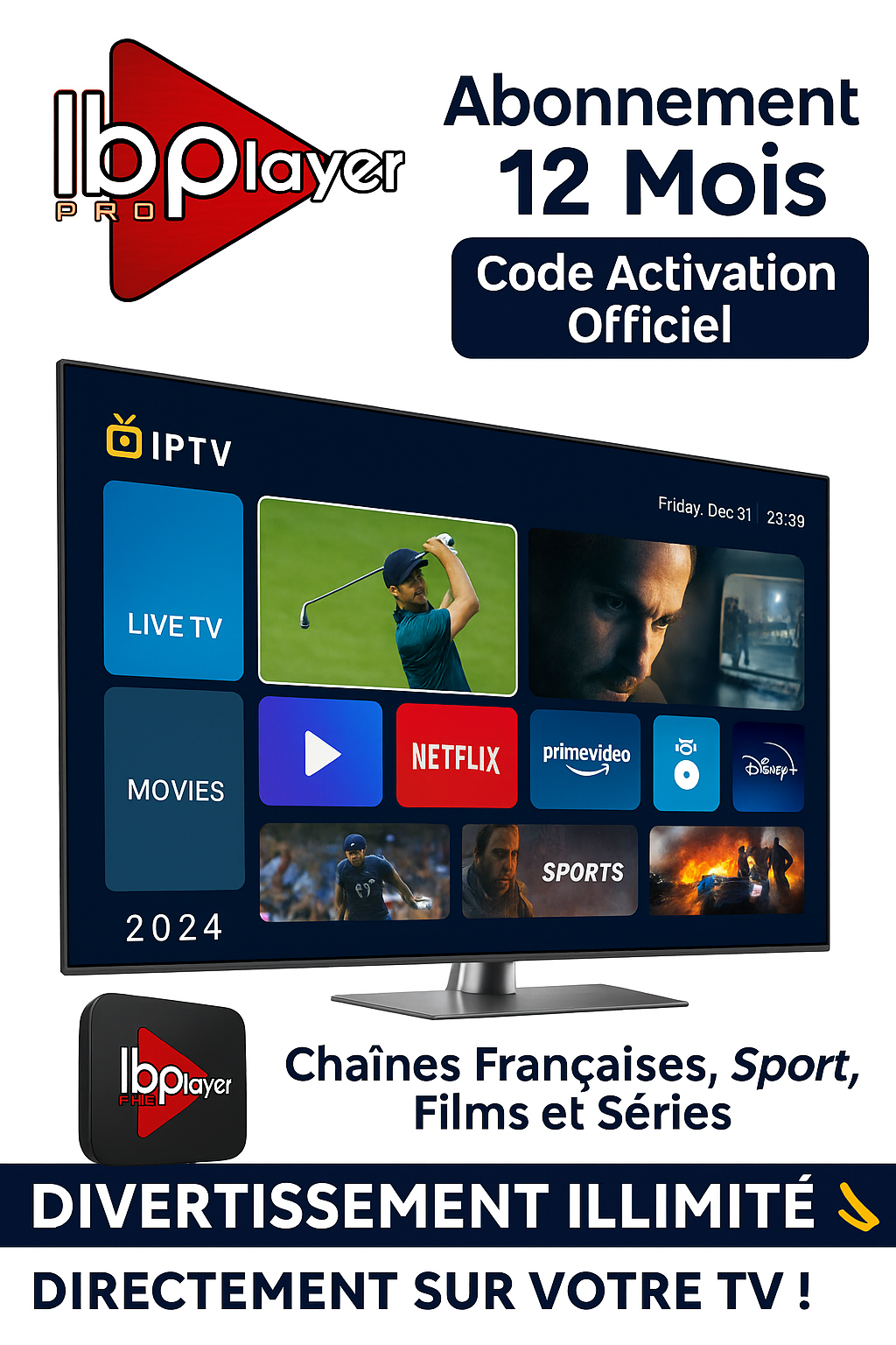 Abonnement IBO Player IPTV 12 mois avec code d’activation officiel. Profitez de vos chaînes françaises, sport, films et séries en HD/4K sur Smart TV Samsung et LG. Installation rapide et interface fluide.
