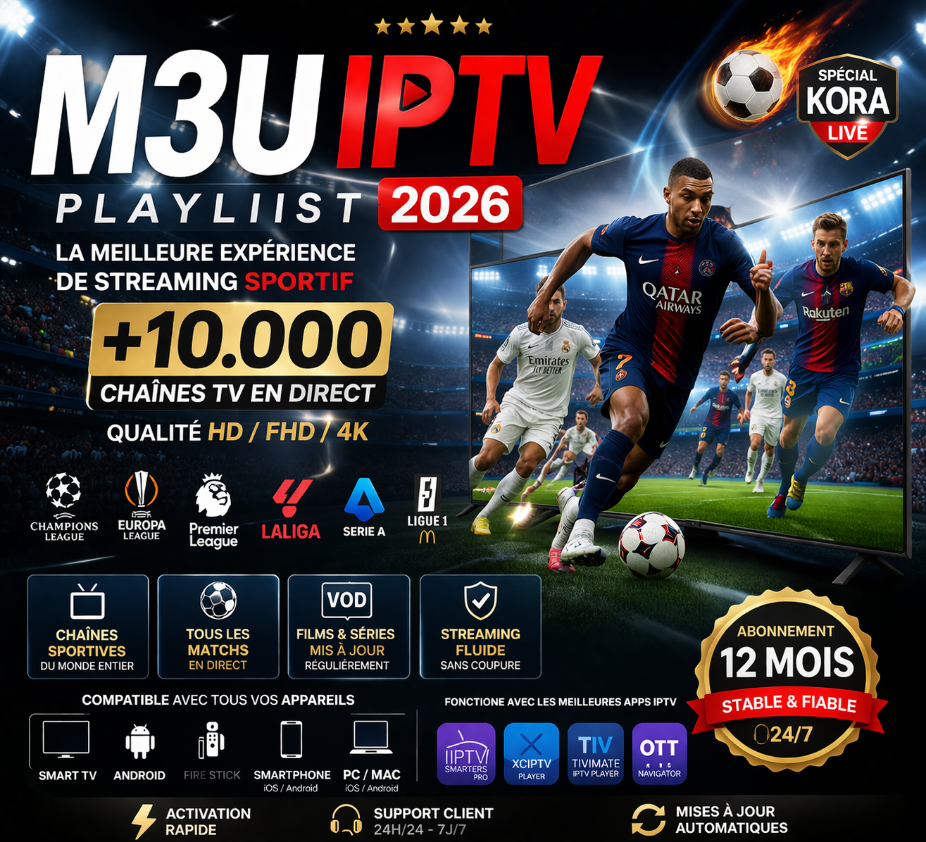 IPTV M3U, abonnement IPTV 12 mois, IPTV 4K, IPTV sans coupure, IPTV France, IPTV Maroc, playlist M3U, IPTV Smart TV, IPTV Android, IPTV 2026